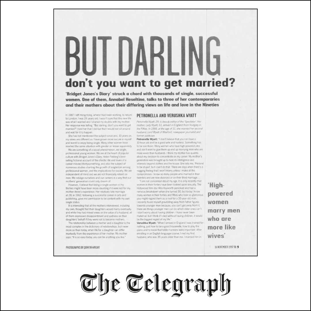 But darling, don’t you want to get married?Bridget Jones’s Diary struck a chord with thousands of single, successful women. One of them, Annabel Heseltine, talks to three of her contemporaries and their mothers about their differing views on life and love in the 90s. Read article